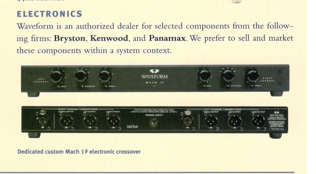 I chose Bryston, a longtime CDN company, within both the pro & consumer audio industries to manufacture the dedicated 3-way active electronic crossover. Waveform was an authorized Internet dealer and I felt aligning myself with this company, might give the brand some added caché or credibility, as the word went in the high-end community. This alignment also allowed Waveform to sell Bryston amps of differing configurations to enhance our income. At the time, I believed there were differences in sound quality between amps. Today I know better than this old upselling mantra. Often in audio, what offends the eyes does not disturb the ears, as has previously been mentioned, was a favoured expression from Dr. Floyd Toole.