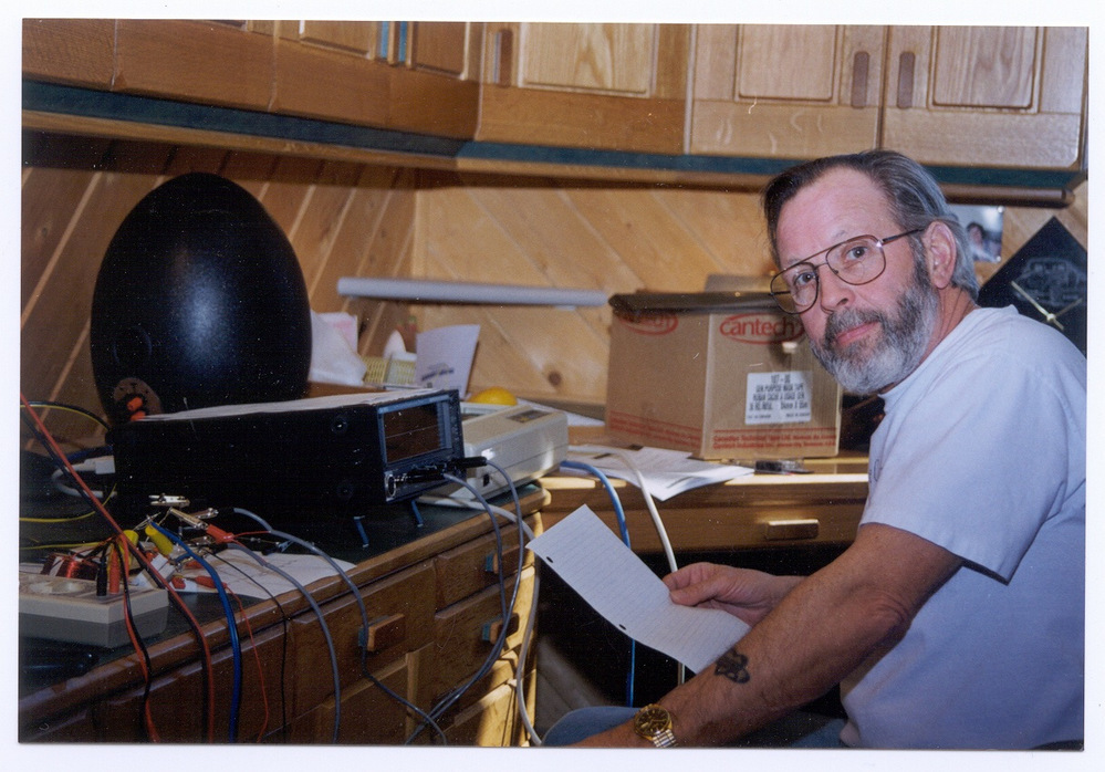 Barry Mitchell QC’in’ passive component configuration in the office with the Audio Control SA-3051 analyzer. Cabinets were quarter-sawn white oak – 1999.