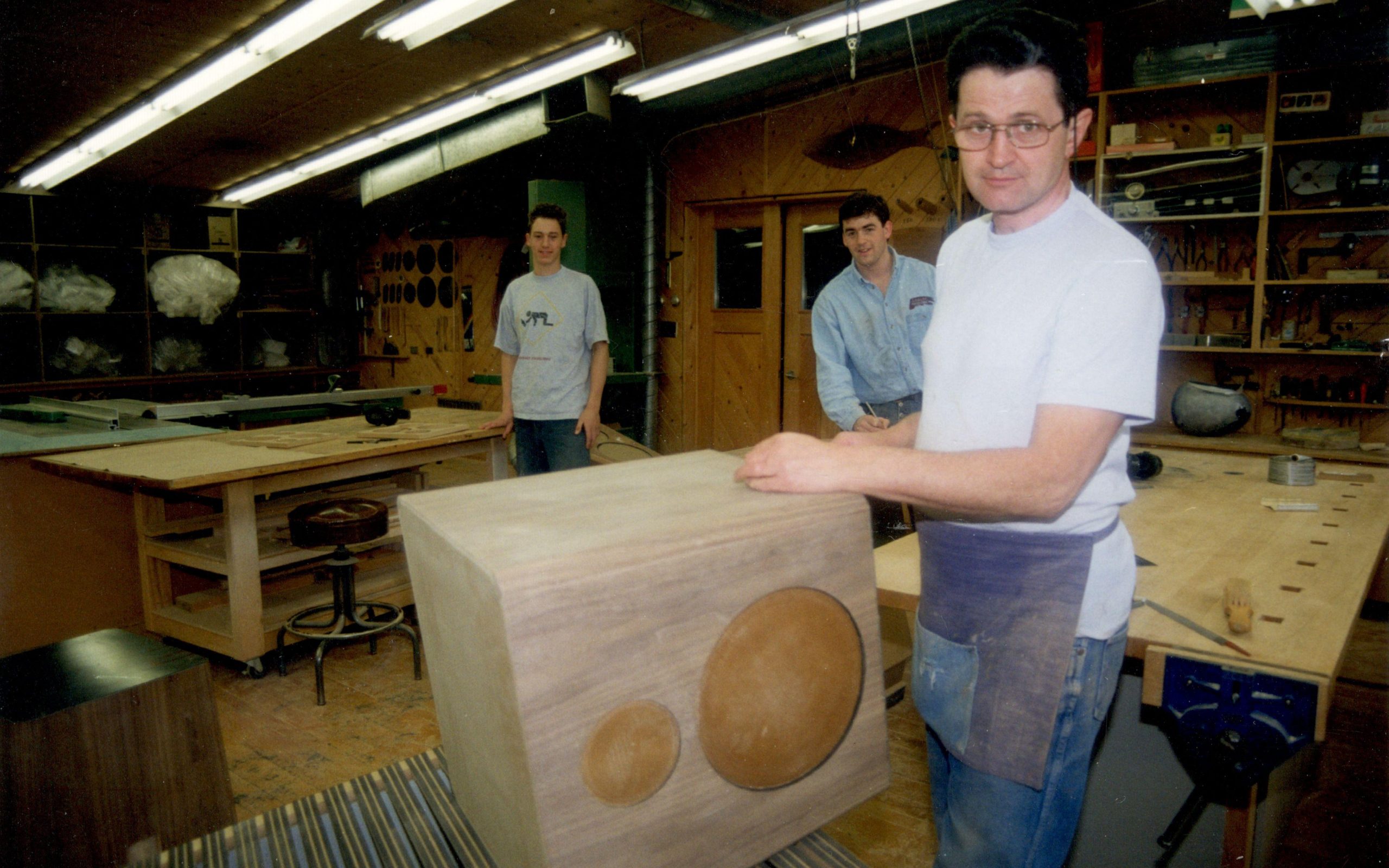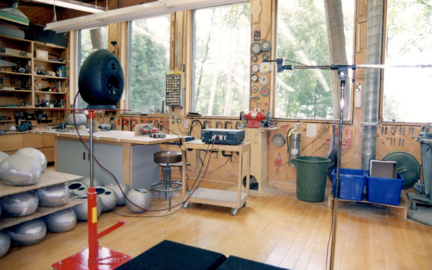 The initial production run of Mach 17 loudspeakers with their wooden lathe turned heads, await the Bryson built 3-way electronic crossover prior to shipment. Clean & shiny floor eh? hahaha Some visitors even removed footwear when arriving. Ahh, respect! 🙂 – 1996.