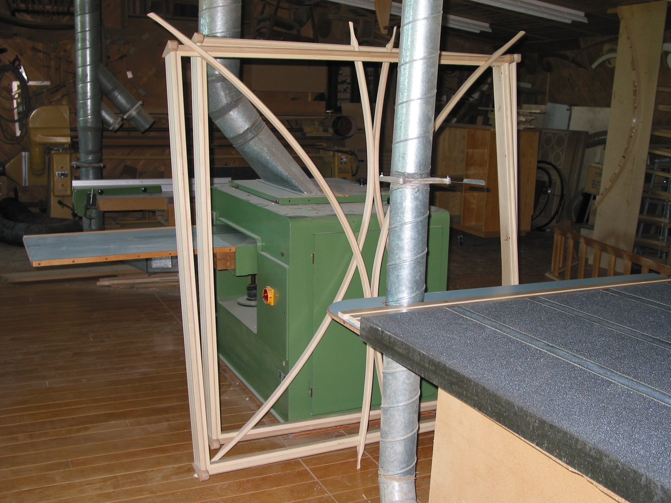 The two white ash frames await the airbrushing of the insulation cover before the ceiling hang. This image is from the Brighton, ON workshop archive.