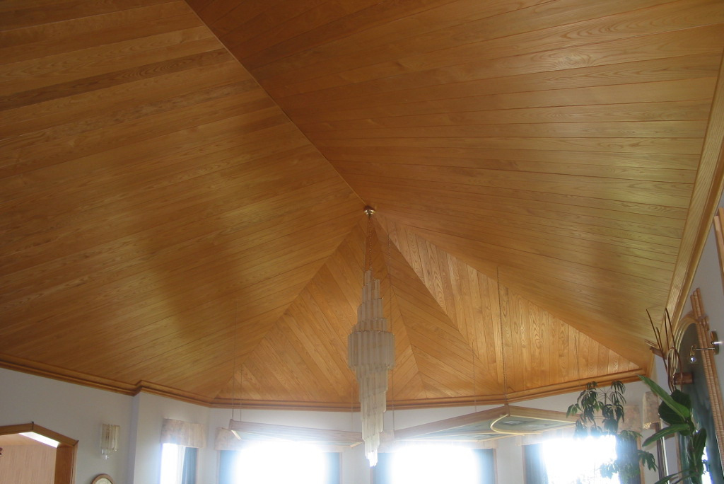 White ash ceiling, hand nailed continuous or single piece strips, sport a low lustre hand rubbed oil finish. Below ceiling level are the newly suspended acoustic panels. – 2002.