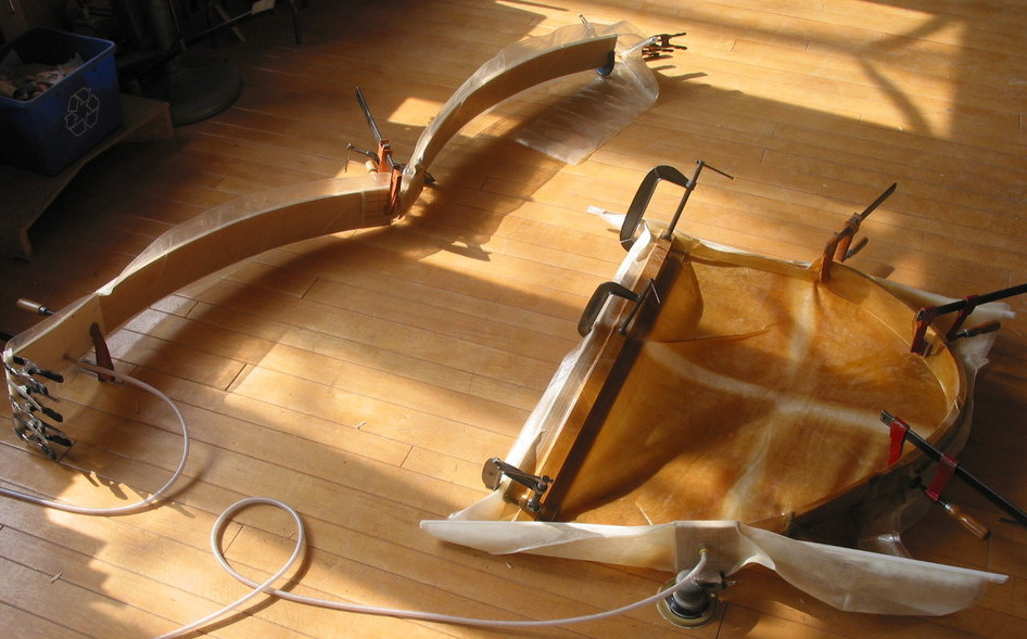 Vacuum bag glue + clamping of top curved rails. The wood was thinly cut on a bandsaw, planed smooth, then glued and clamped with a slow setting adhesive. This is vacuum bagging using the pressure [14.7psi] of the atmosphere. It’s a reverse process using a special vacuum pump that sucks the air out of a very heavy poly bag, which becomes the clamp. Metal clamps are added where the curvature of the form needed more than 14.7 psi – 2003.
