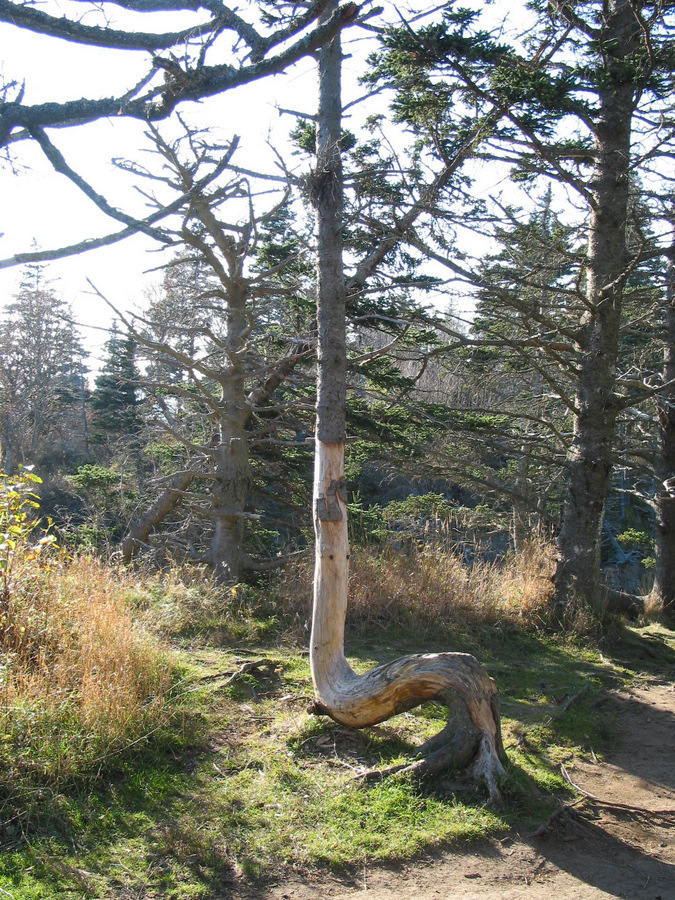 “The wind made me do it.” Atop Cape Split just before the final leg of the uphill slog for the panoramic view. Yet another dead black spruce, as with Kinky.